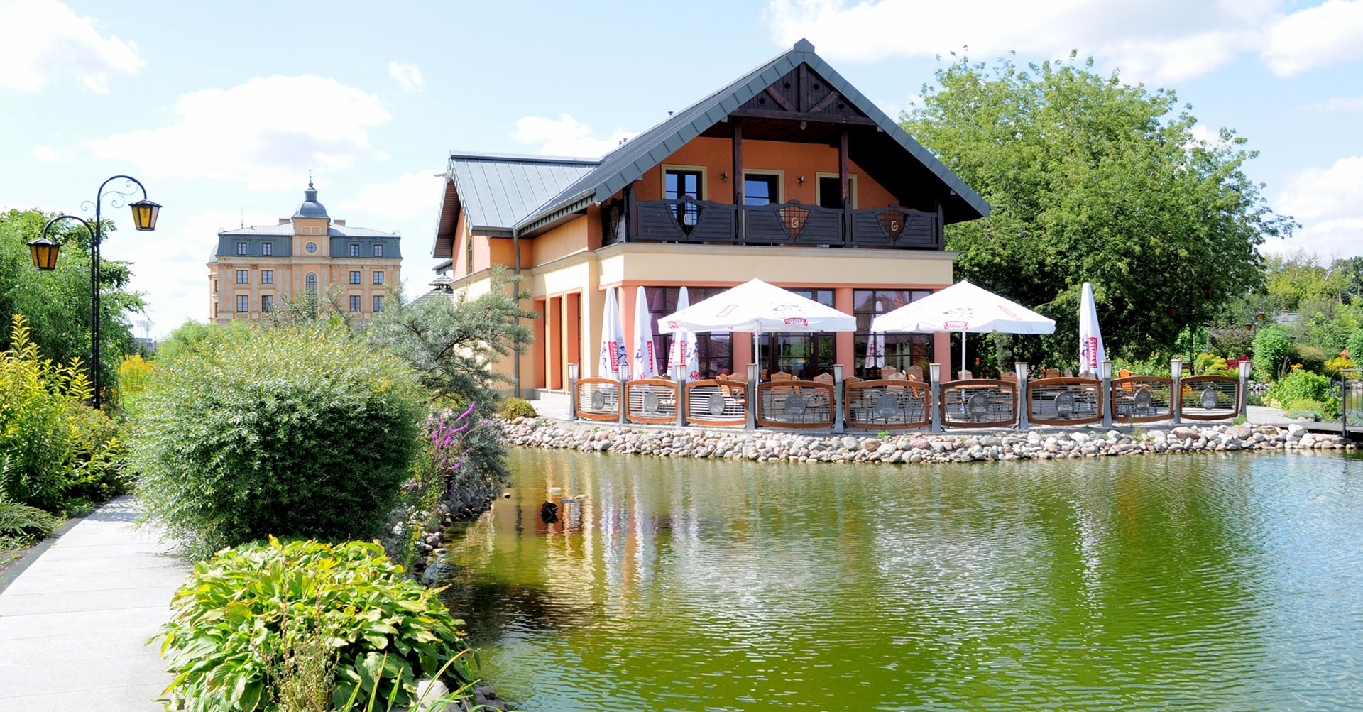 Zapraszamy do urządzonej z wielkim gustem i rozmachem pałacowej restauracji serwującej dania tradycyjnej kuchni polskiej a także potrawy kuchni włoskiej, Pabu w stylu angielskim a także złotej sali balowej, fińskiej sauny, mini SPA, centrum konferencyjnego.