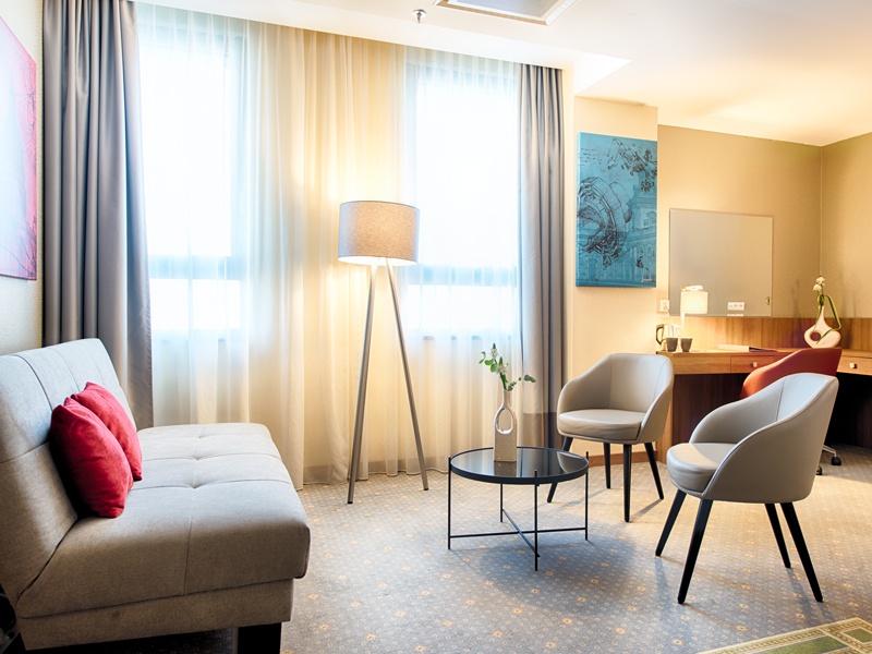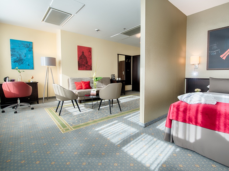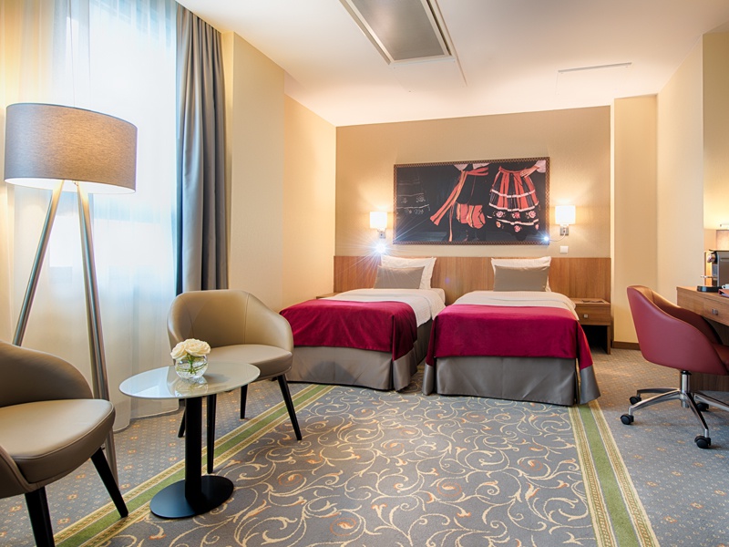 Łóżko podwójne lub łóżka pojedyńcze, biurko, telewizor z płaskim ekranem, kanały satelitarne, radio, telefon, Wi-fi ( 1GB/s), minibar, minilodówka, ekspres do kawy na kapsułki, woda mineralna, prysznic, suszarka do włosów, kosmetyki, codzienne sprzątanie, room service, dostęp do gazet on-line